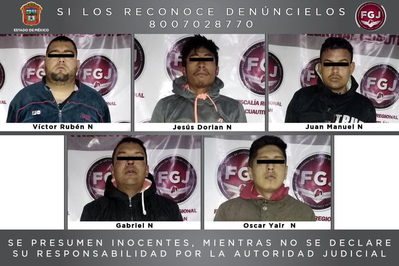 Se trata de Jesús Dorian «N», de 22 años de edad; Juan Manuel «N», de 26 años, Víctor Rubén «N», de 25 años de edad, Oscar Yair «N» de 22 años y Gabriel «N» de 26 años, quienes habrías removido dos cajeros automáticos que se encontraban en una plaza comercial, en la colonia Villas de Cuautitlán.