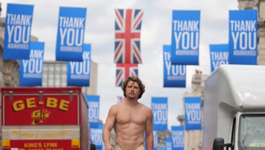 Hace unas horas se hizo viral en redes sociales la aparición de un sujeto en calles de Londres casi desnudo; pues solo llevaba un cubrebocas puesto, pero como tanga.
